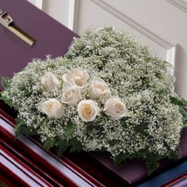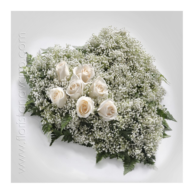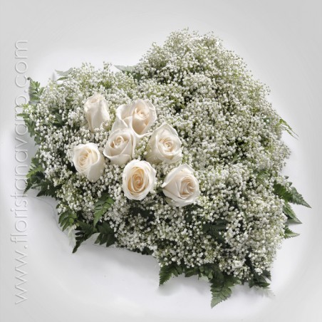 Extremely simple heart-shaped cushion, made with white panniculata flower and white roses. A simple, elegant and sweet small present to say goodbye to a loved one.