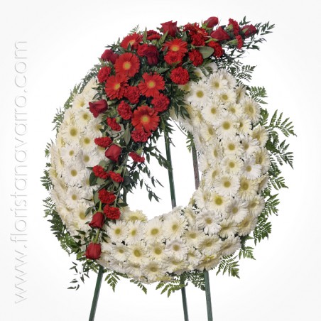 Corona realizada con flor de gerbera blanca y detalle lateral por la misma flor en color rojo, media docena de rosas y clavel rojo, decoradas en verdes diversos, aro de 80cm de diámetro de espuma con agua para que la flor esté en perfectas condiciones. Servicio a todos los tanatorios de Barcelona y alrededores.