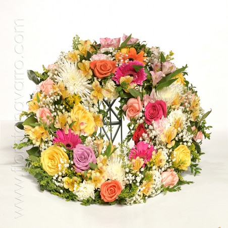 Corona de flores naturales en ara de 40 cm de diámetro realizada con rosas, altromelia, panniculata, gerberas y anastasia de diferentes colores.