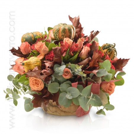 Centro de flores en una base de madera compuesto por rosas naranjas, claveles rojos, alstromerias, calabazas pequeñas y diferentes verdes ornamentales.