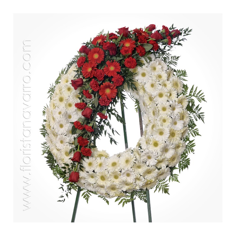 Couronne faite avec fleur de marguerite gerbera blanche et un détail latéral composé de la même fleur en rouge, d'une demi-douzaine de roses et d'un œillet rouge, le tout entouré de divers verts, dans un cerceau de 80 cm de mousse humide pour que la fleur soit en parfait état. Service à toutes les maisons funéraires de Barcelone et ses environs.